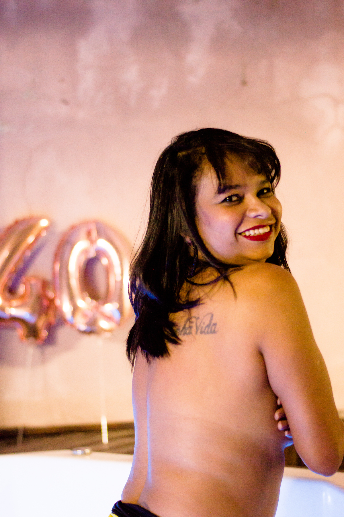 Ela escolheu fazer seu primeiro ensaio no eu aniversário de 40 anos. O local escolhido foi a casa de uma amiga, ela se sentiu a vontade e disposta para mergulhar, literalmente, na minha ideia, e gostamos muito de como ficou.