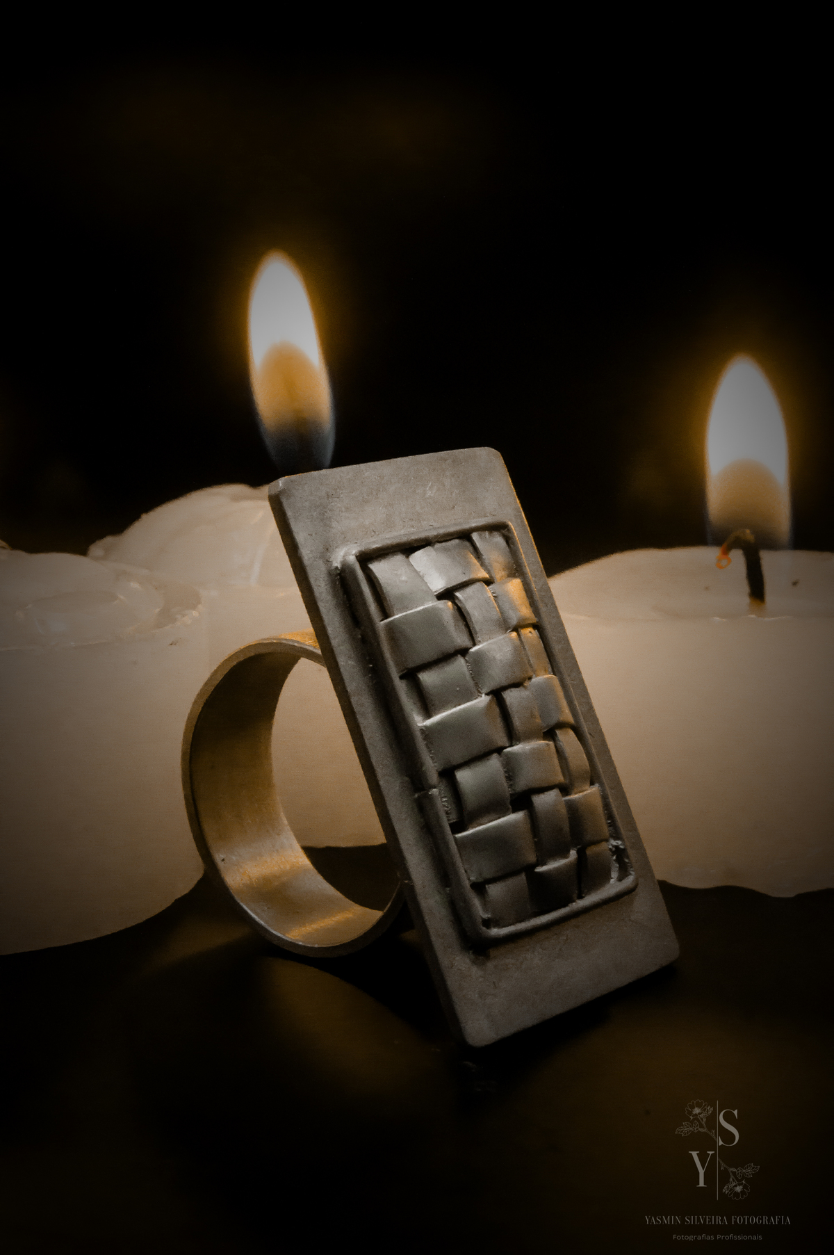 Fotos artísticas de joias, feitas no estudio com fundo infinito e cenário caseiro.